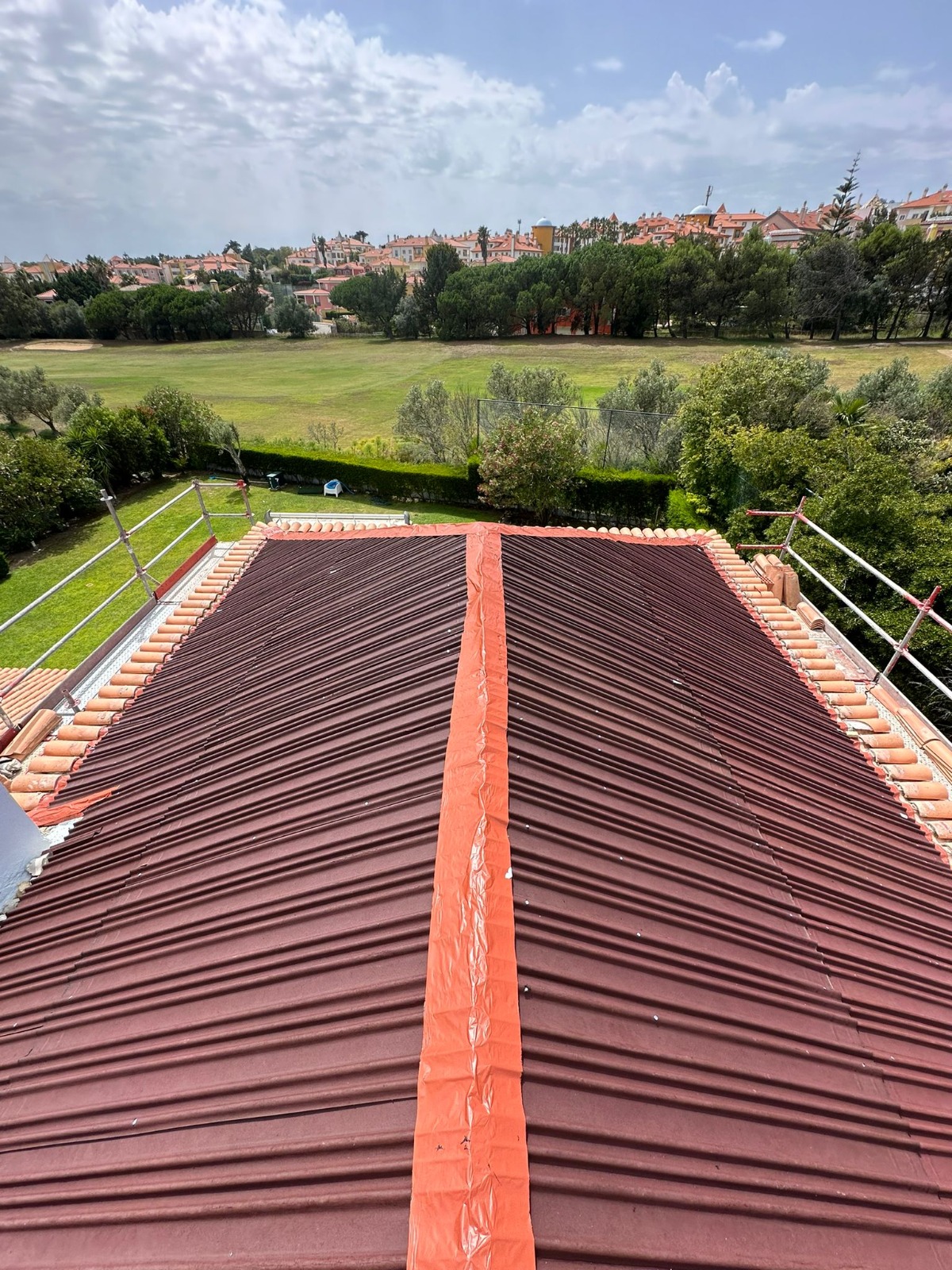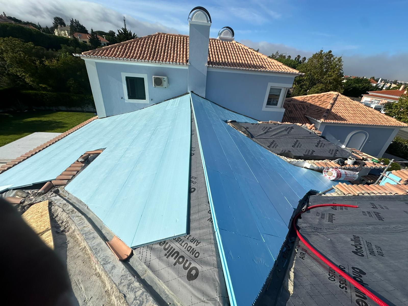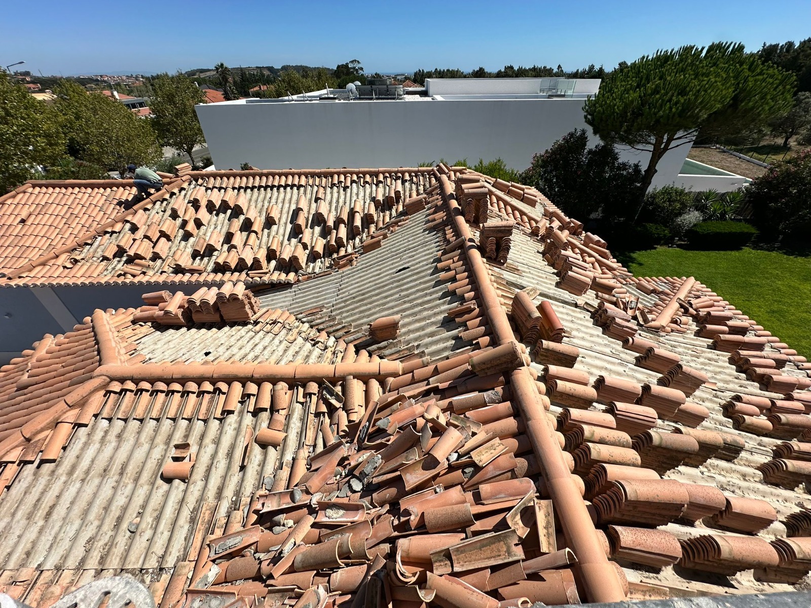 Demolição e execução de novo telhado na Quinta da Beloura. Remoção de subtelhas contendo amianto, com recurso a métodos especiais de segurança conforme legislação.