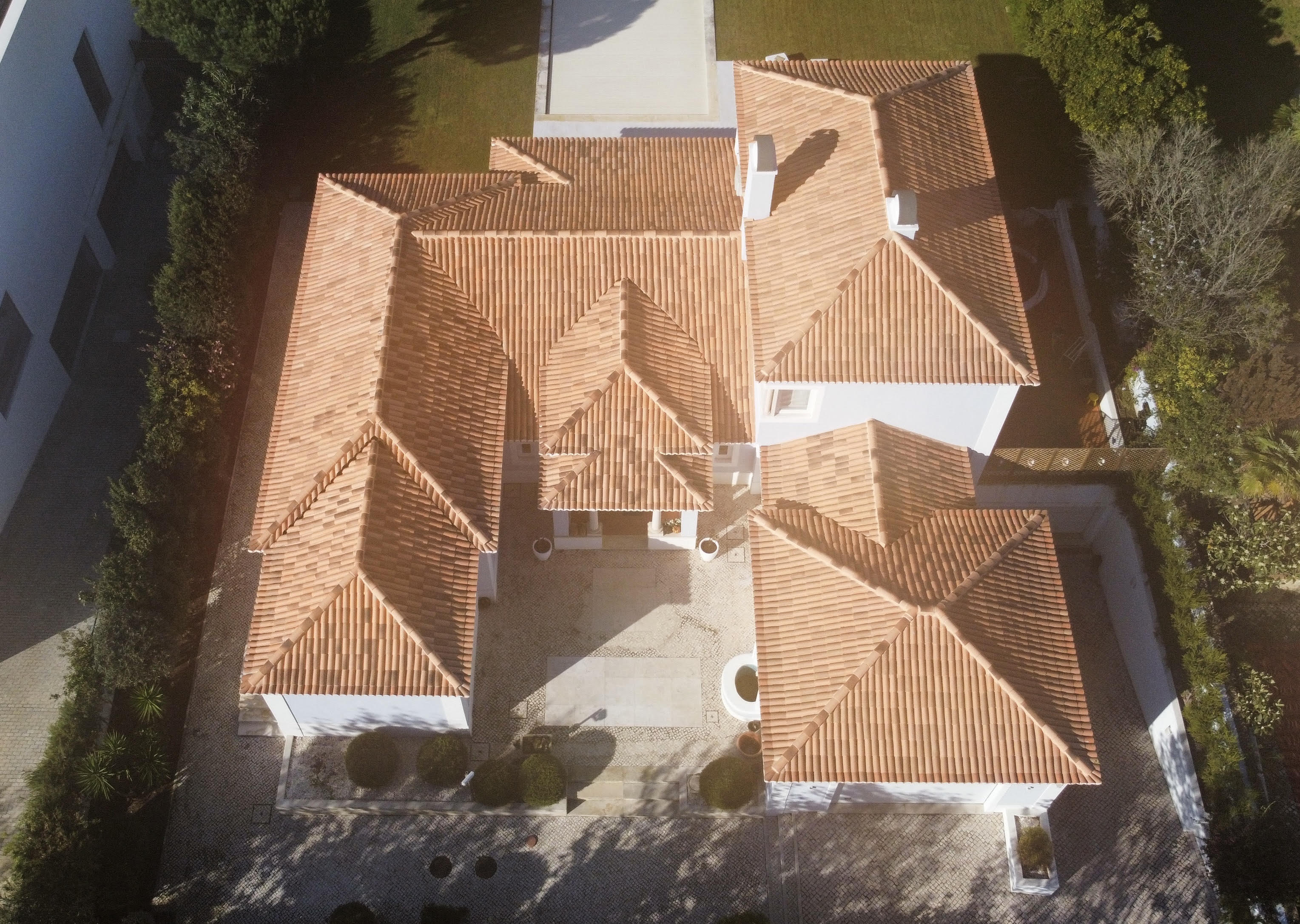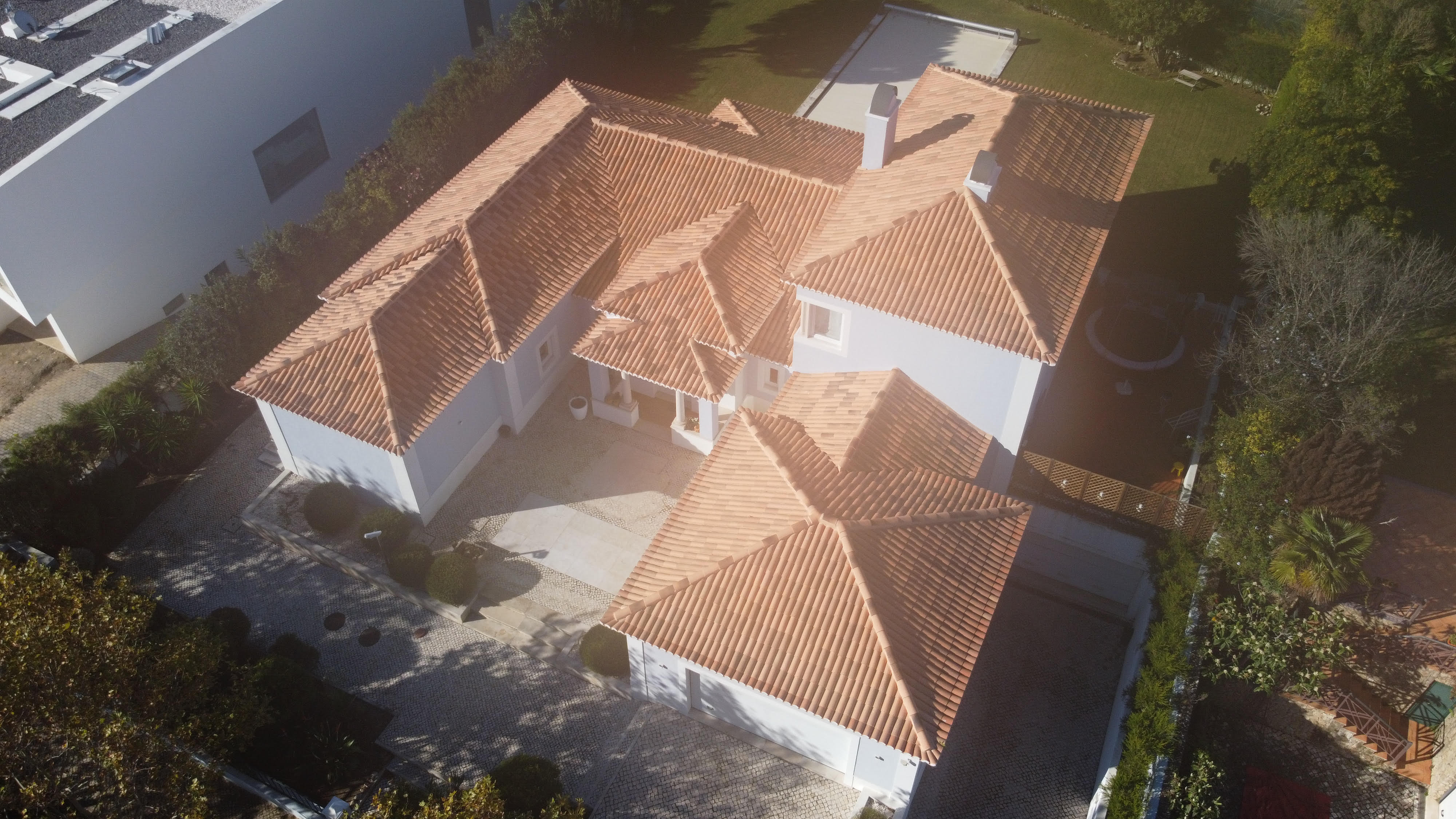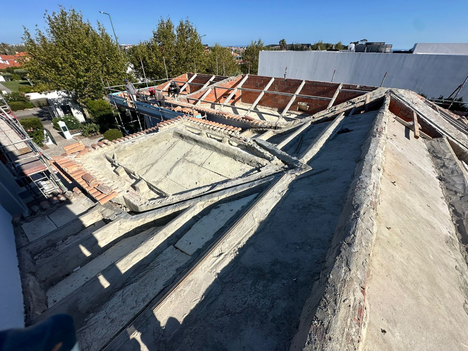 Demolição e execução de novo telhado na Quinta da Beloura. Remoção de subtelhas contendo amianto, com recurso a métodos especiais de segurança conforme legislação.
